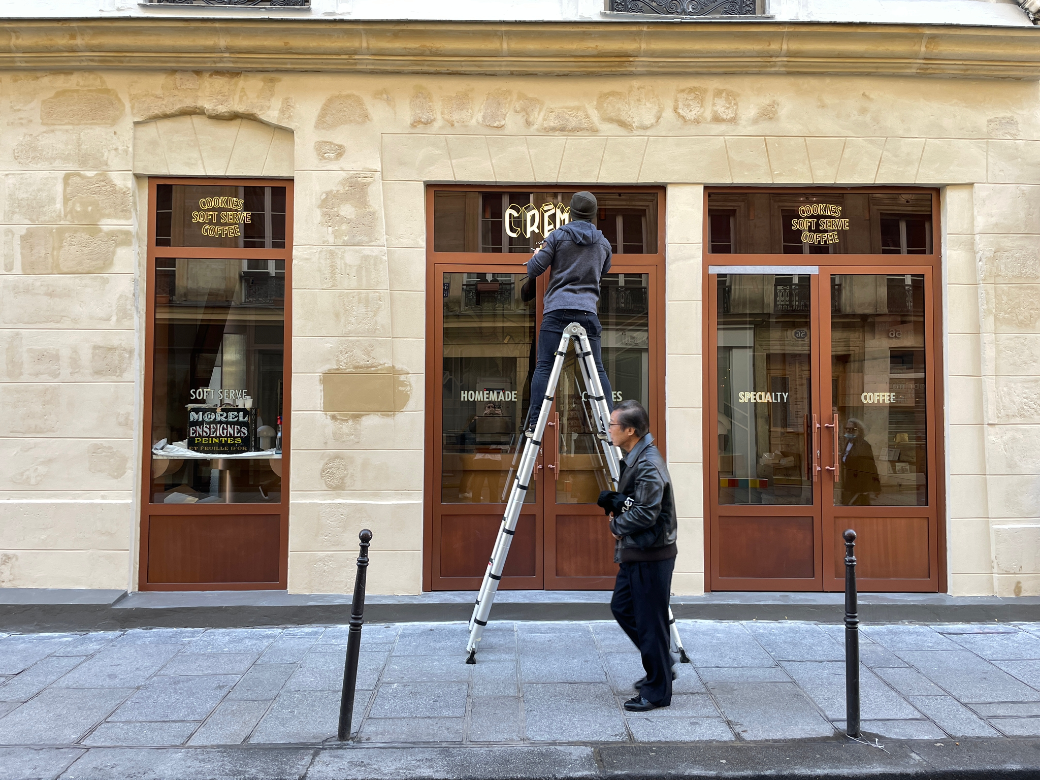 What a blast we had, Mo Signs and I, to gild and paint this coffee shop / cookie place in the heart of Le Marais. Real gold leaf and white paint for this tip top quality architectural realisation.