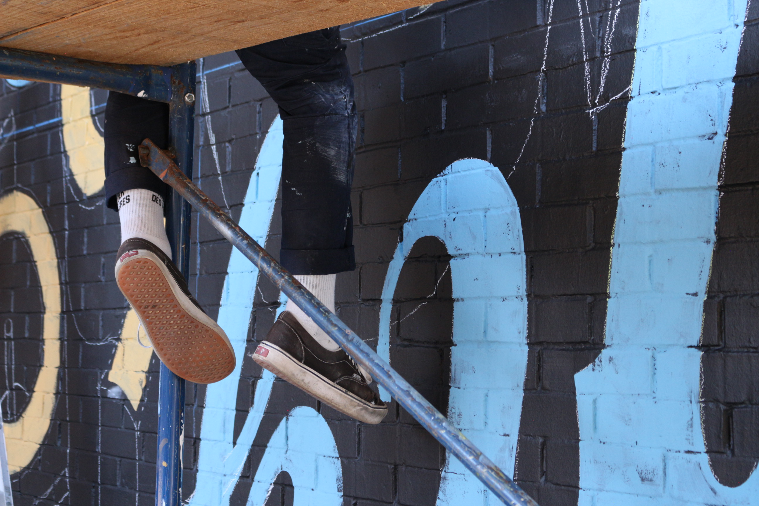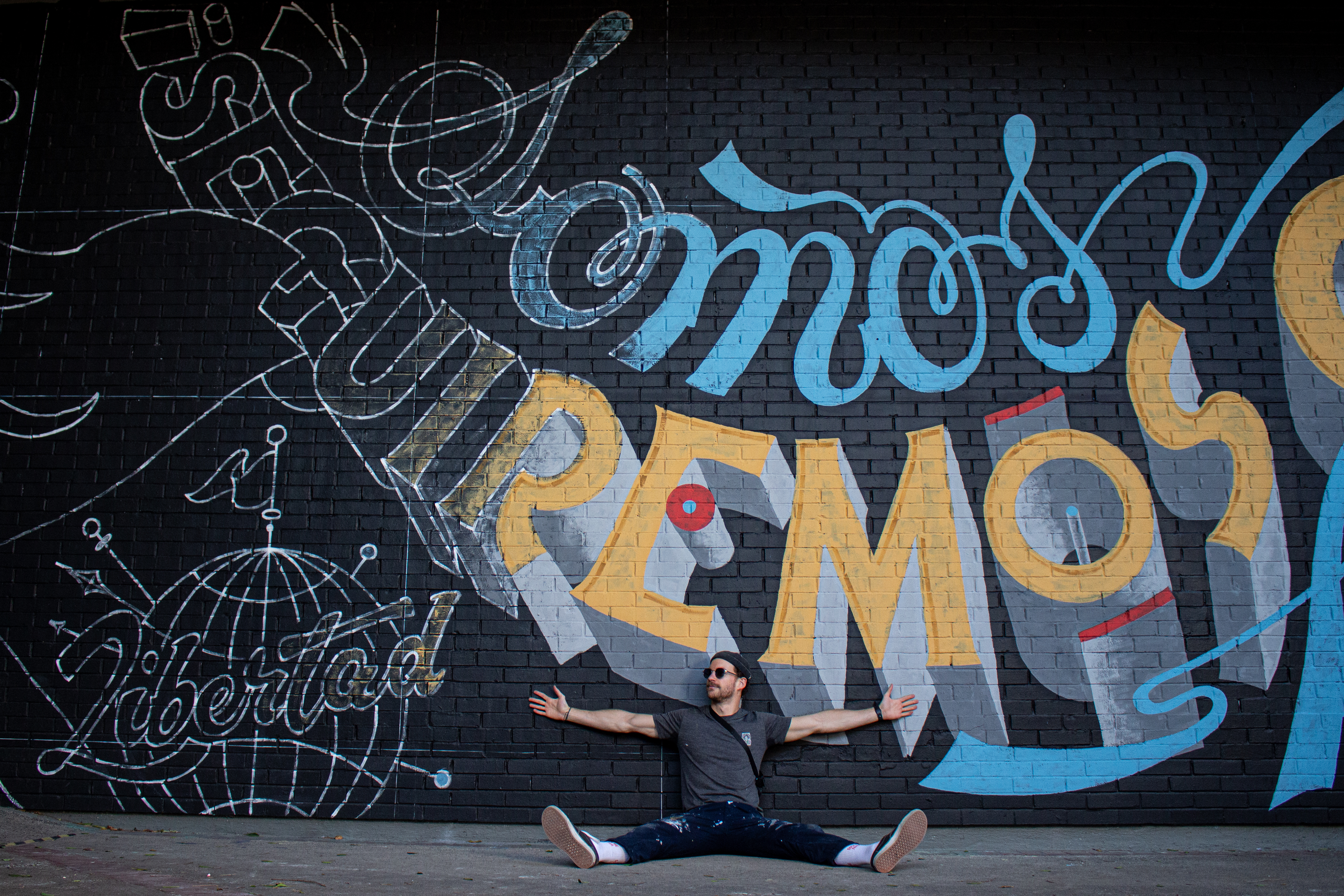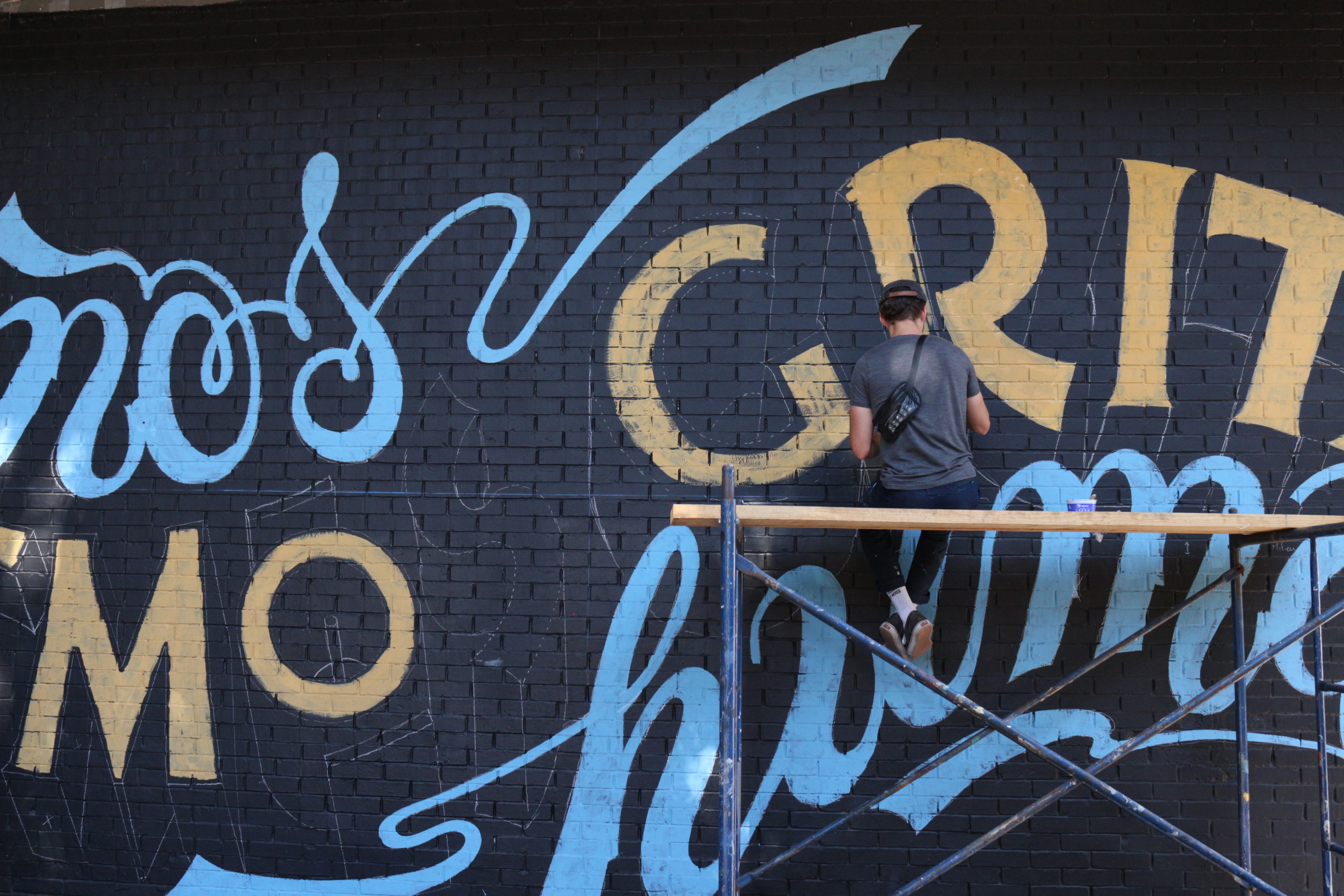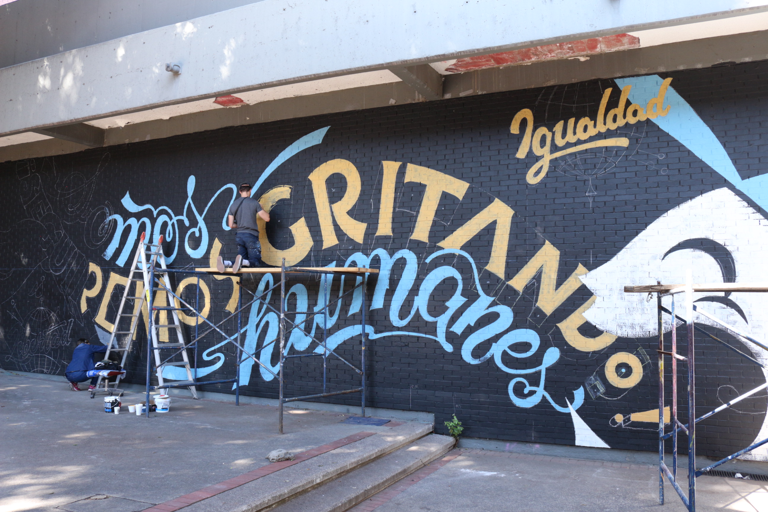 After giving a lecture on my journey as a sign painter at the University of Mexico for the 75th anniversary of the Declaration of Human Rights, then giving two days of workshops to the art faculty students, and finally spending several days assisting them in the creation of a 50-meter-long wall that they all painted together, I was fortunate enough that the university gave me a wall to create a personal piece (still on the theme of the anniversary of the declaration). A wall of about fifteen meters, completed in four days with sometimes a pair of hands or two to help me to finish it before leaving for the airport for my return to Paris.