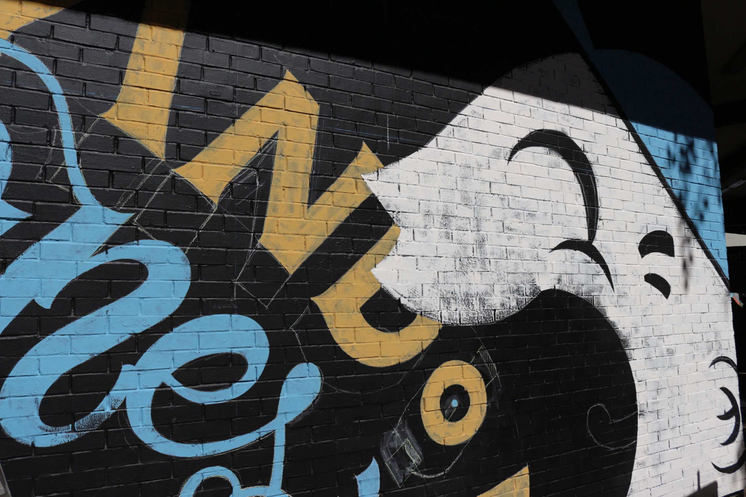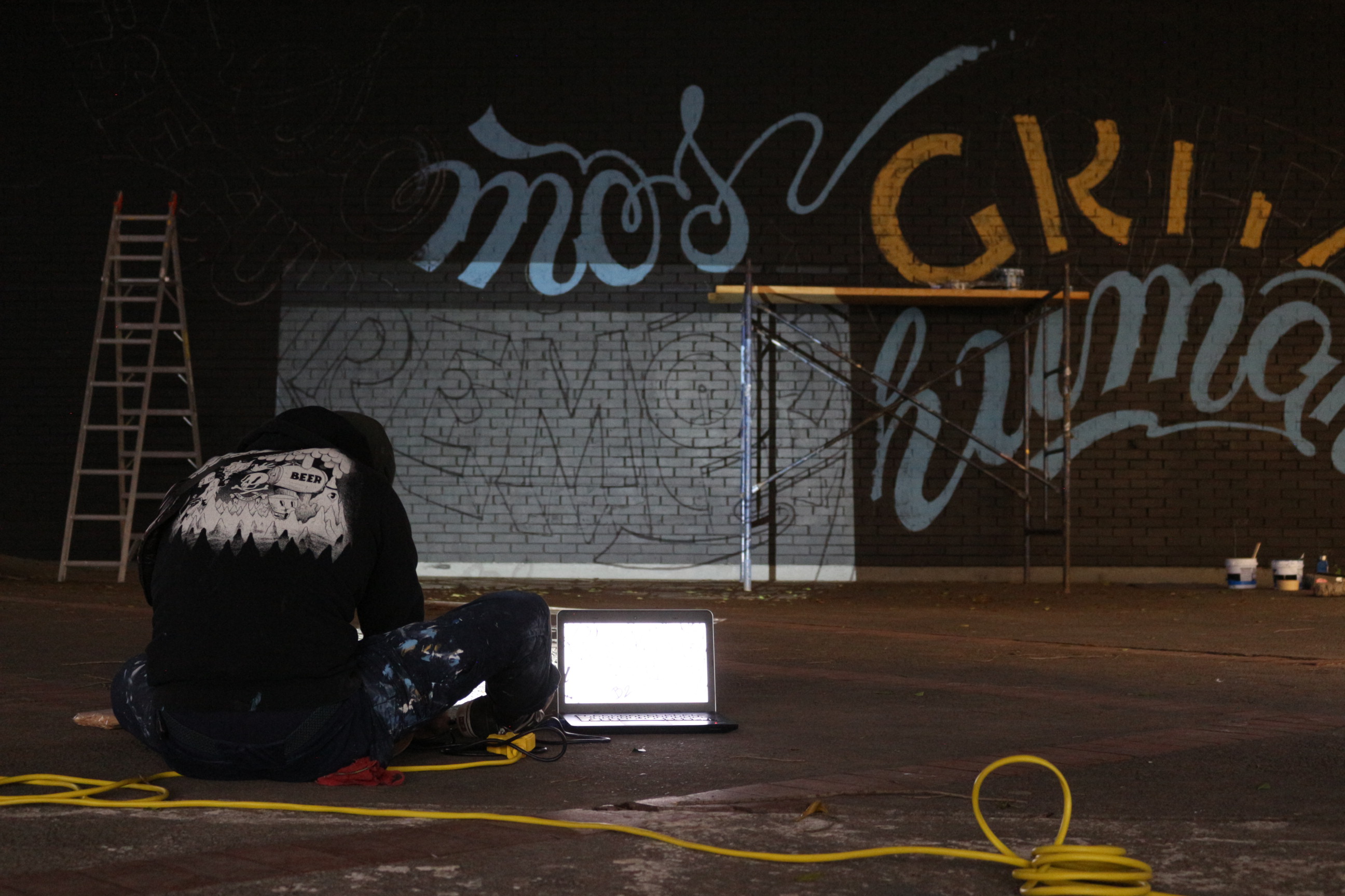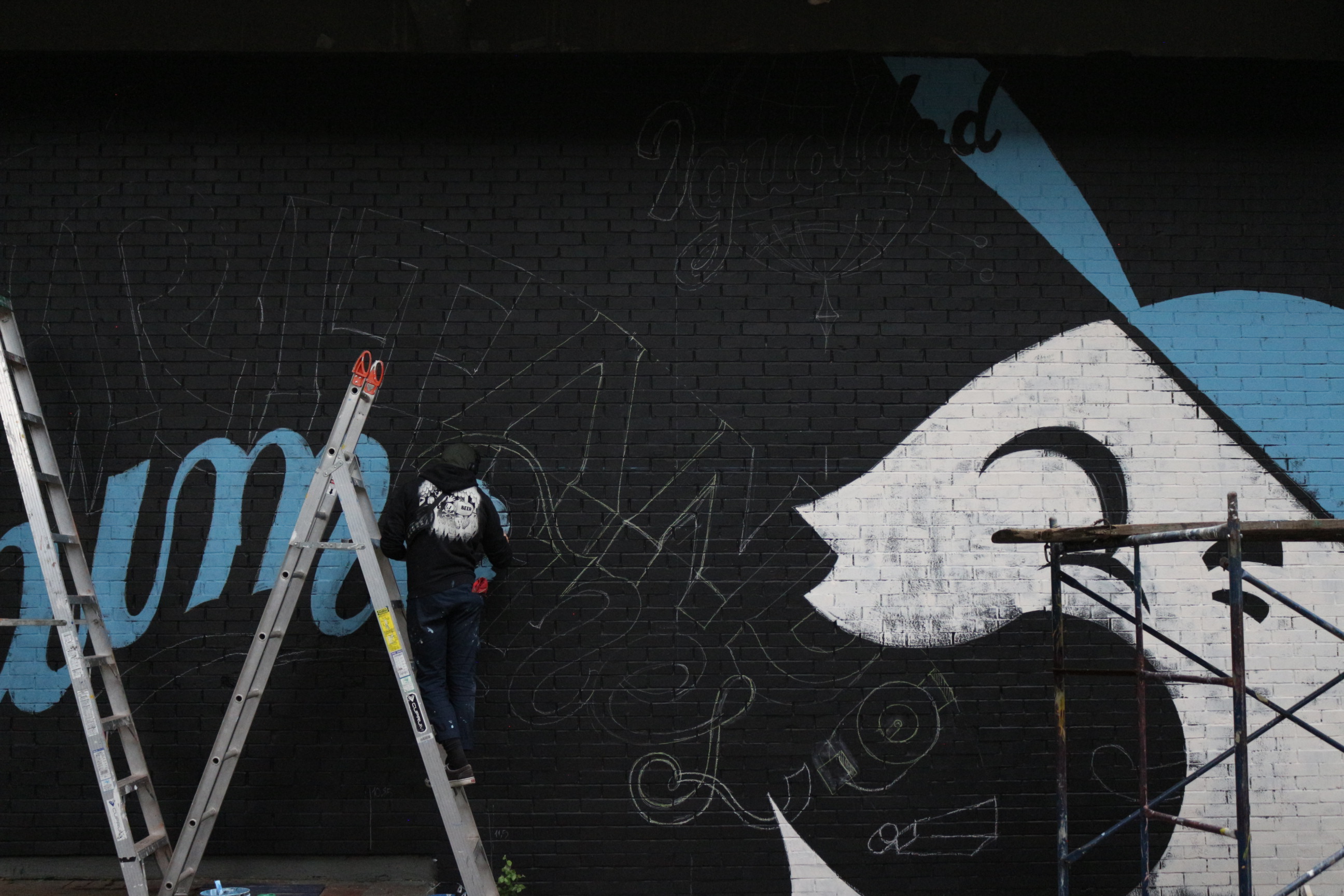 Après avoir donné une conférence sur mon parcours de peintre en lettres à l’université de Mexico à l’occasion du 75ème anniversaire de la déclaration des droits de l’homme, puis d’avoir donné 2 jours de workshop aux étudiant de la faculté d’art et enfin d’avoir passé plusieurs jours à les assister sur la réalisation d’un mur de 50 mètre de long qu’ils ont eu à peindre tous ensemble, j’ai eu la chance que l’université me cède un mur pour que je réalise une création personnelle (toujours sur le thème de l’anniversaire de la déclaration). Mur d’une grosse quinzaine de mètres, réalisé en 4 jours avec parfois une paire de main ou deux pour m’aider à terminer avant de partir pour l’aéroport pour mon retour pour Paris.