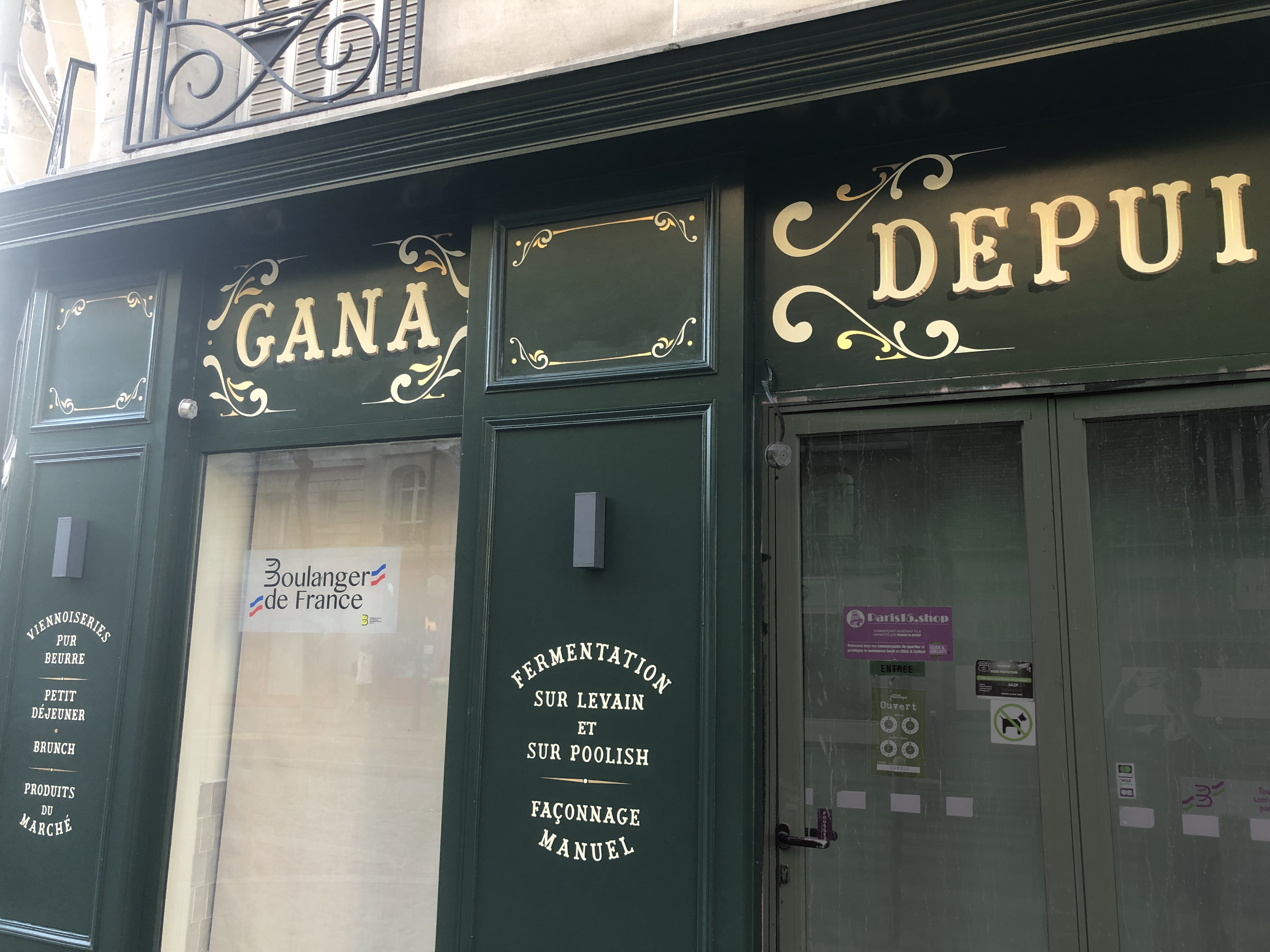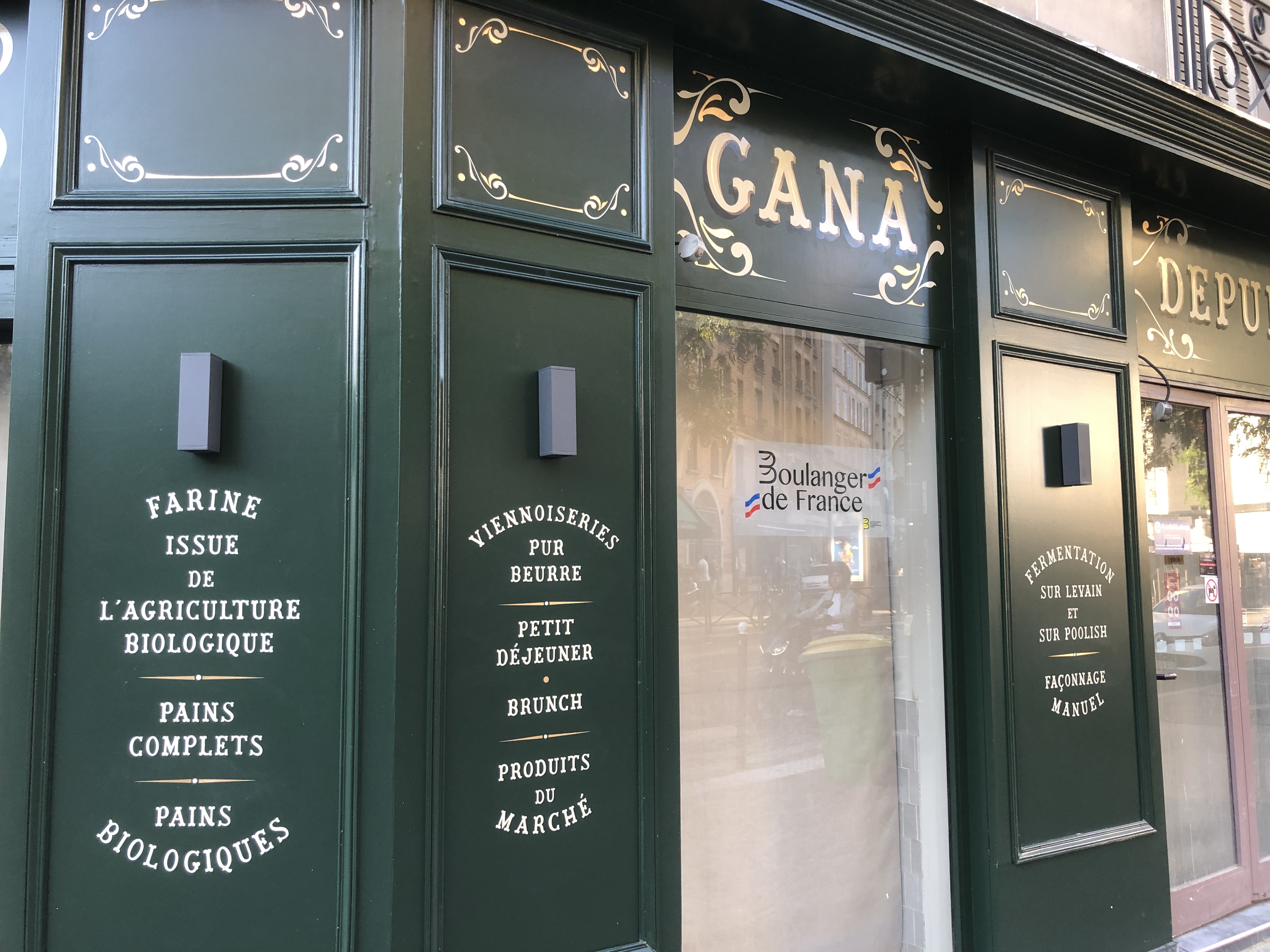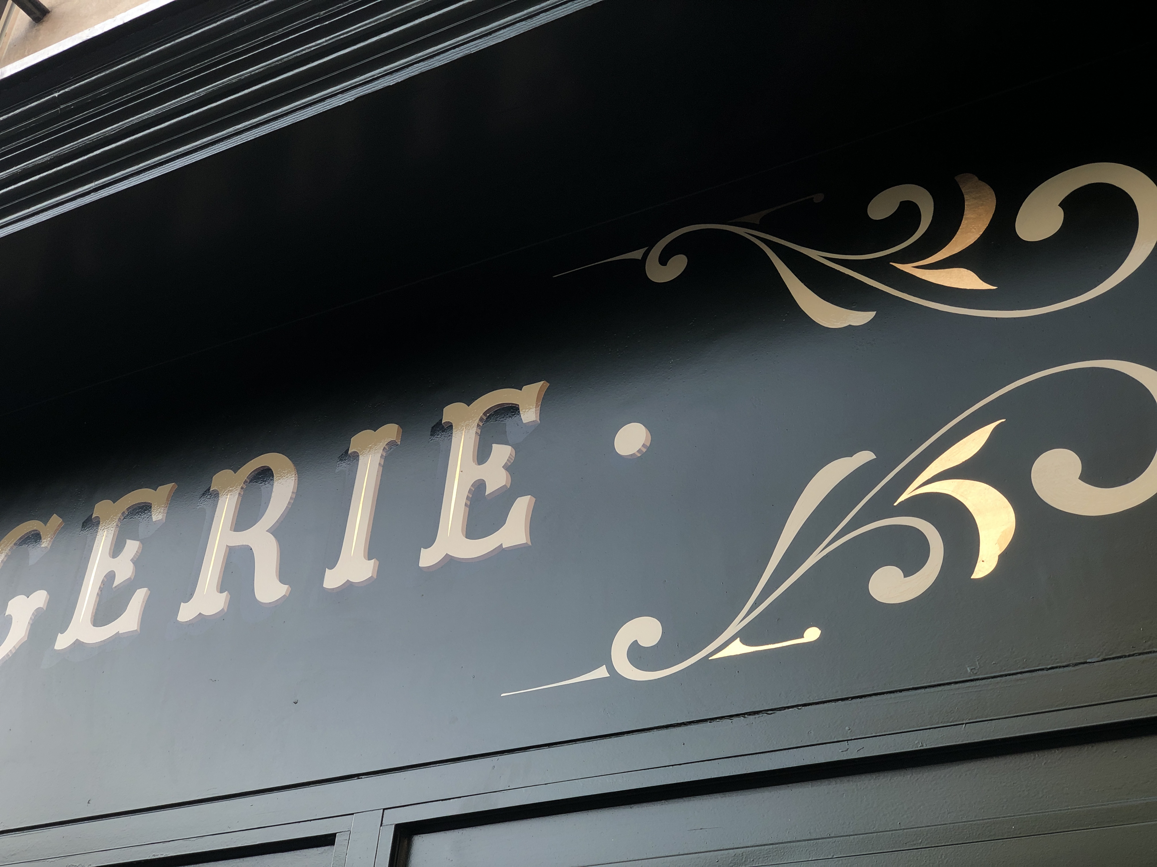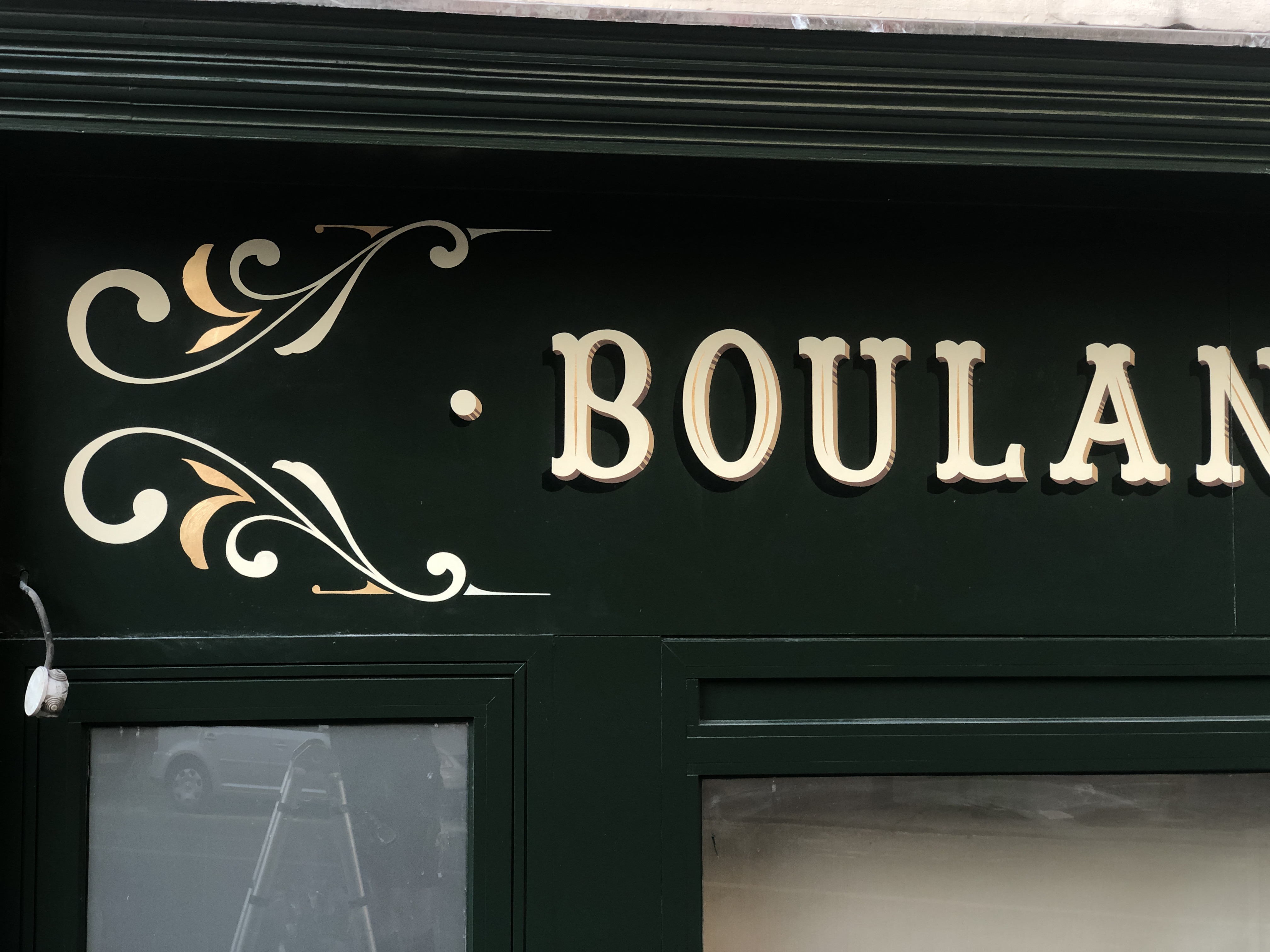 Lettrages sur mesure, enseignes et colonnes, réalisés pour la Boulangerie Gana Zola, dans le 15ème arrondissement de Paris. Lettrages inspirés des enseignes Boulle de la fin du XIXème, avec ici un effet 3D et ainsi qu’une ombre portée et des ornements pour habiller l’ensemble. Le tout peints à la main, 4 couleurs et feuille d’or 23 carats rouge pour certains détails.