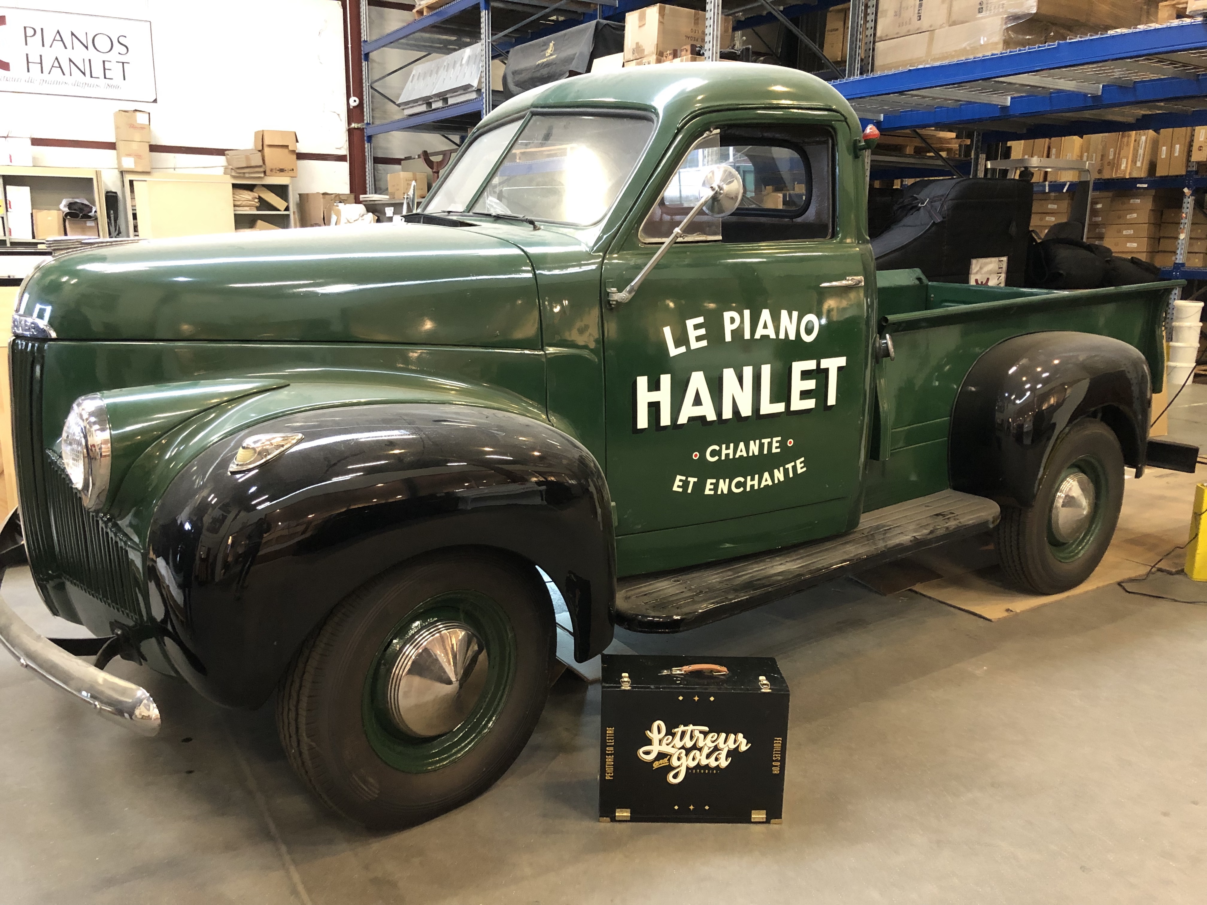 J’ai eu le plaisir de réaliser un lettrage sur un camion Studebacker pour l’entreprise de piano Hanlet. La petite histoire de ce camion est folle car il a appartenu à la première génération de dirigeant de la société Hanlet, dans les années 50. Et en 2020, l’arrière petit fils de cet ancien dirigeant, qui est actuellement le patron de l’entreprise piano Hanlet, à retrouvé cet exact même camion sur le marché de l’occasion et l’a racheté pour le faire revenir dans la société et dans la famille Hanlet.
