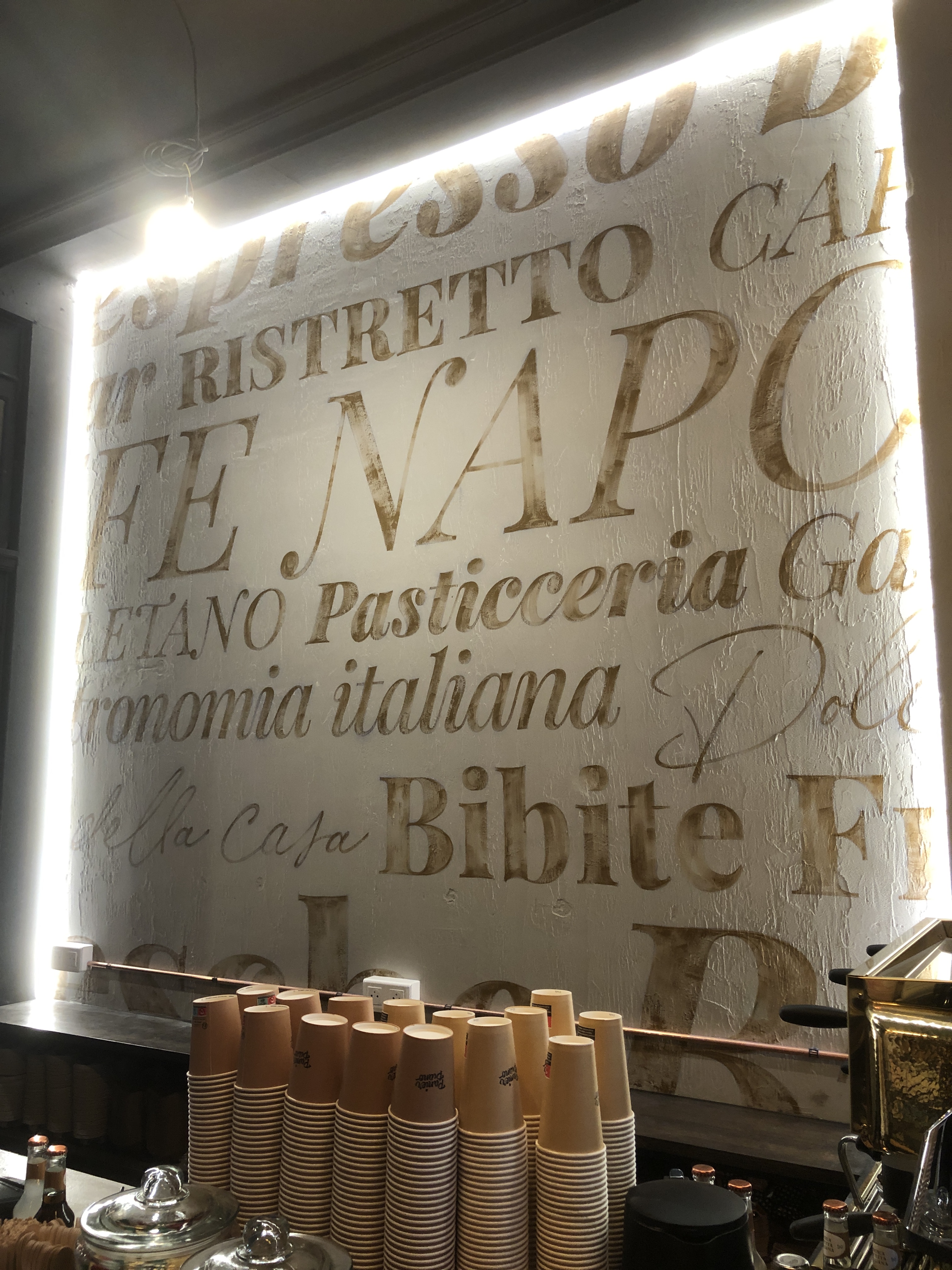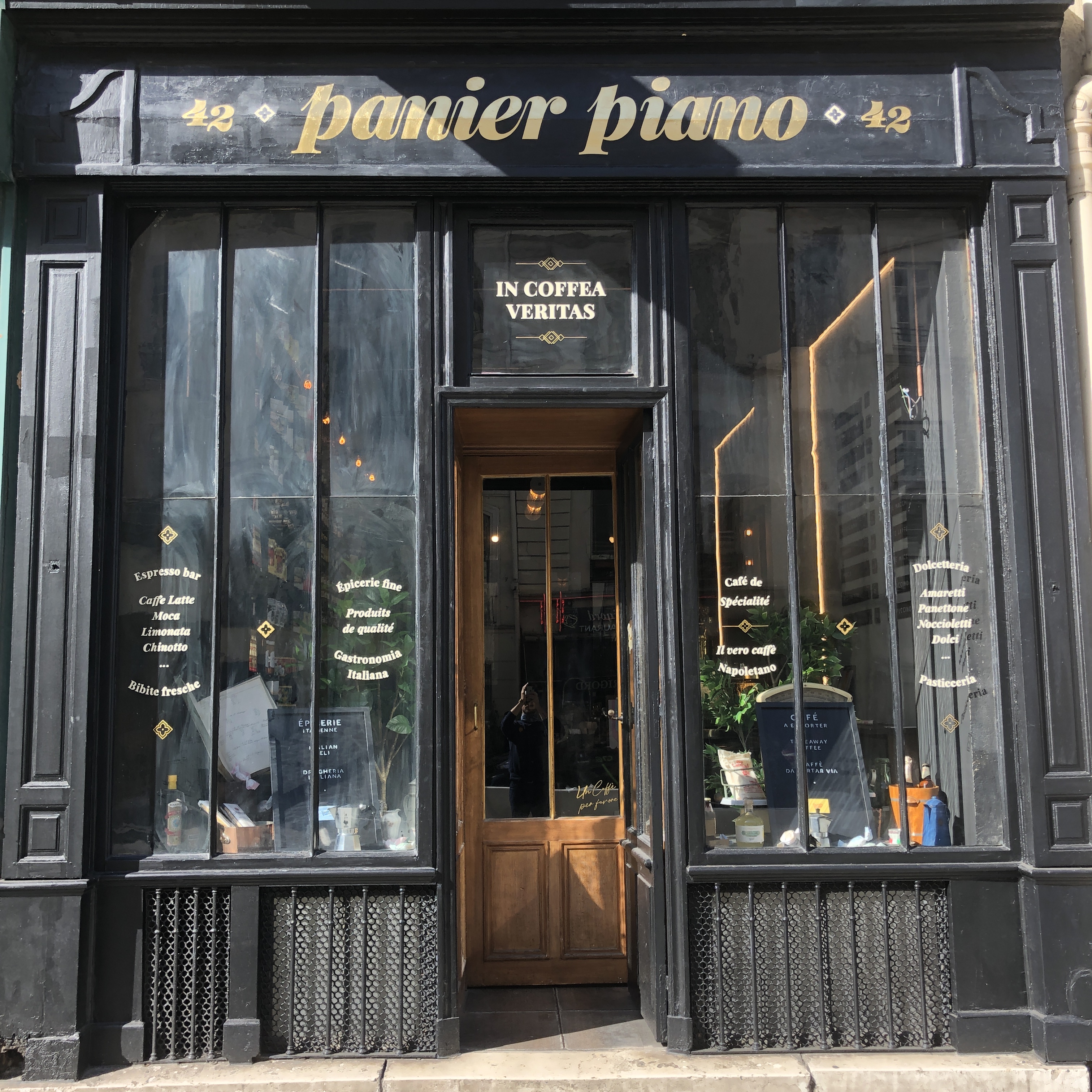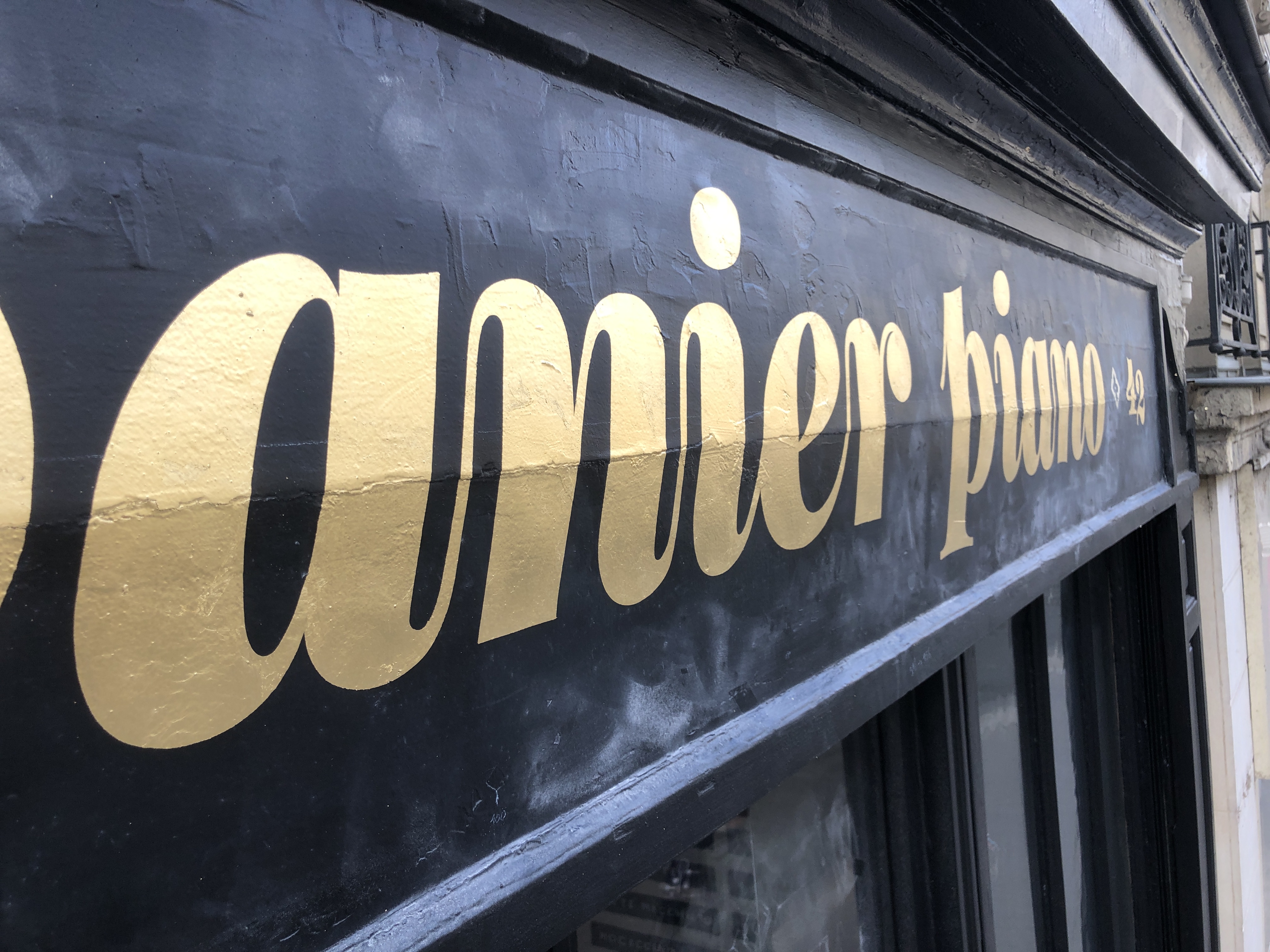 Création de lettrages sur mesure pour la façade extérieure du café Napolitain « Panier Piano » dans le 5ème arrondissement de Paris. Peinture à la main et feuille d’or mat 23 carats, sur les vitres de type atelier, ainsi que sur l’enseigne. Inscriptions en français et en italien. Réalisation de lettrage sur mur en béton brut à l’intérieur, reprise des termes qui sont sur la façade en tailles très variable et dans plusieurs typo, pour créer un jeux graphique plus qu’une suite de mot vraiment lisible, le tout avec un effet usé dit « Distressed ».