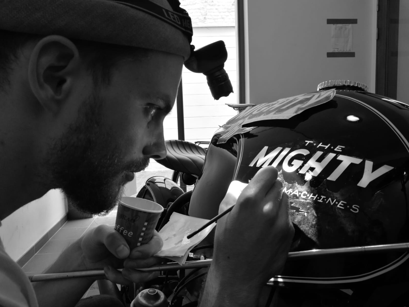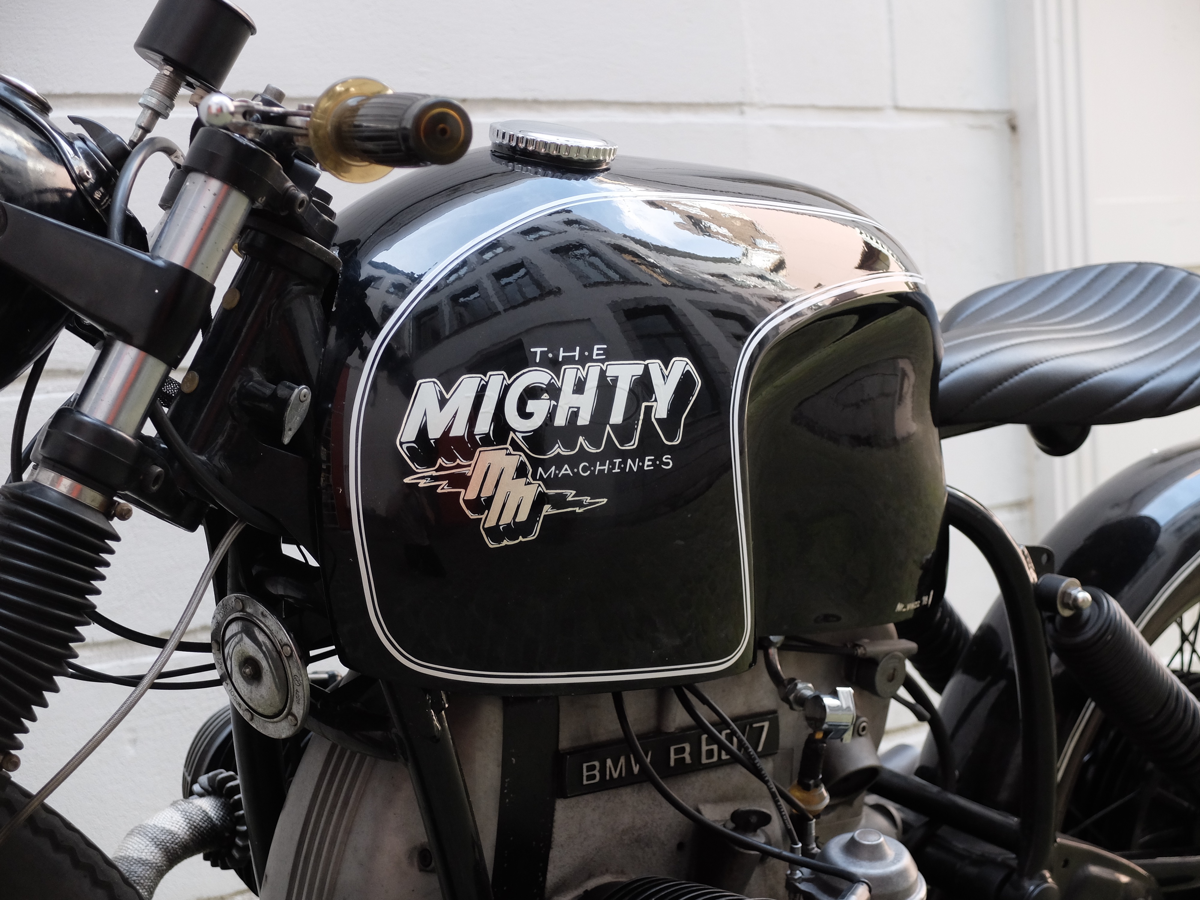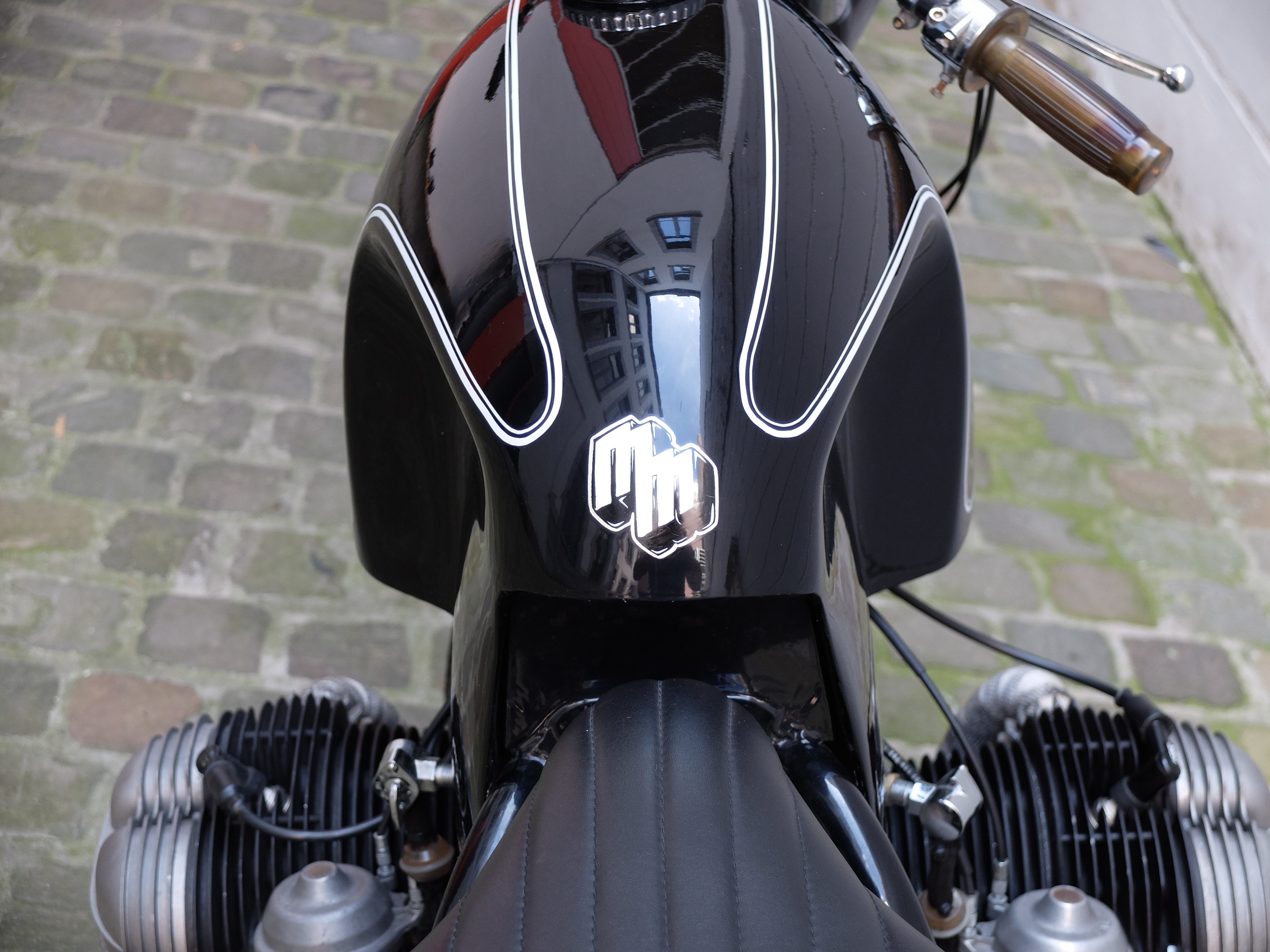 Lettrage sur mesure créé, peint et doré sur un réservoir de BMW R60/7 de 1969 complètement customisé par son propriétaire, un motard Belge venant d’Anvers.