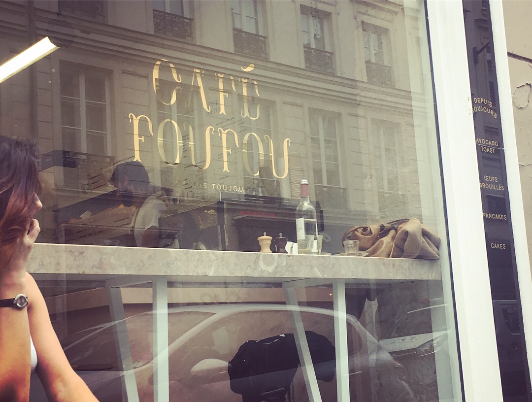 Réalisation à la feuille d’or 23 carats du logo du café foufou, et peinture de quelques mots en doré sur les colonnes extérieur en marbre noir.