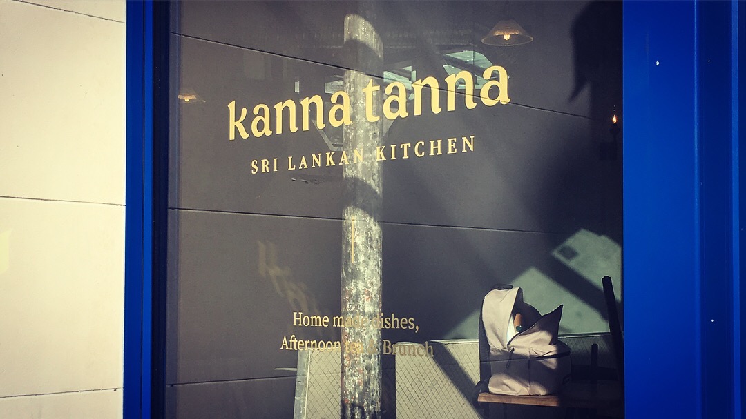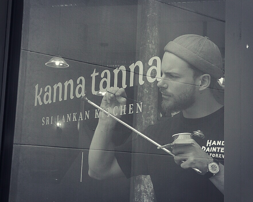 Water gilded lettering and logo with 22 carat gold leaf for the restaurant Kanna Tanna in Paris.