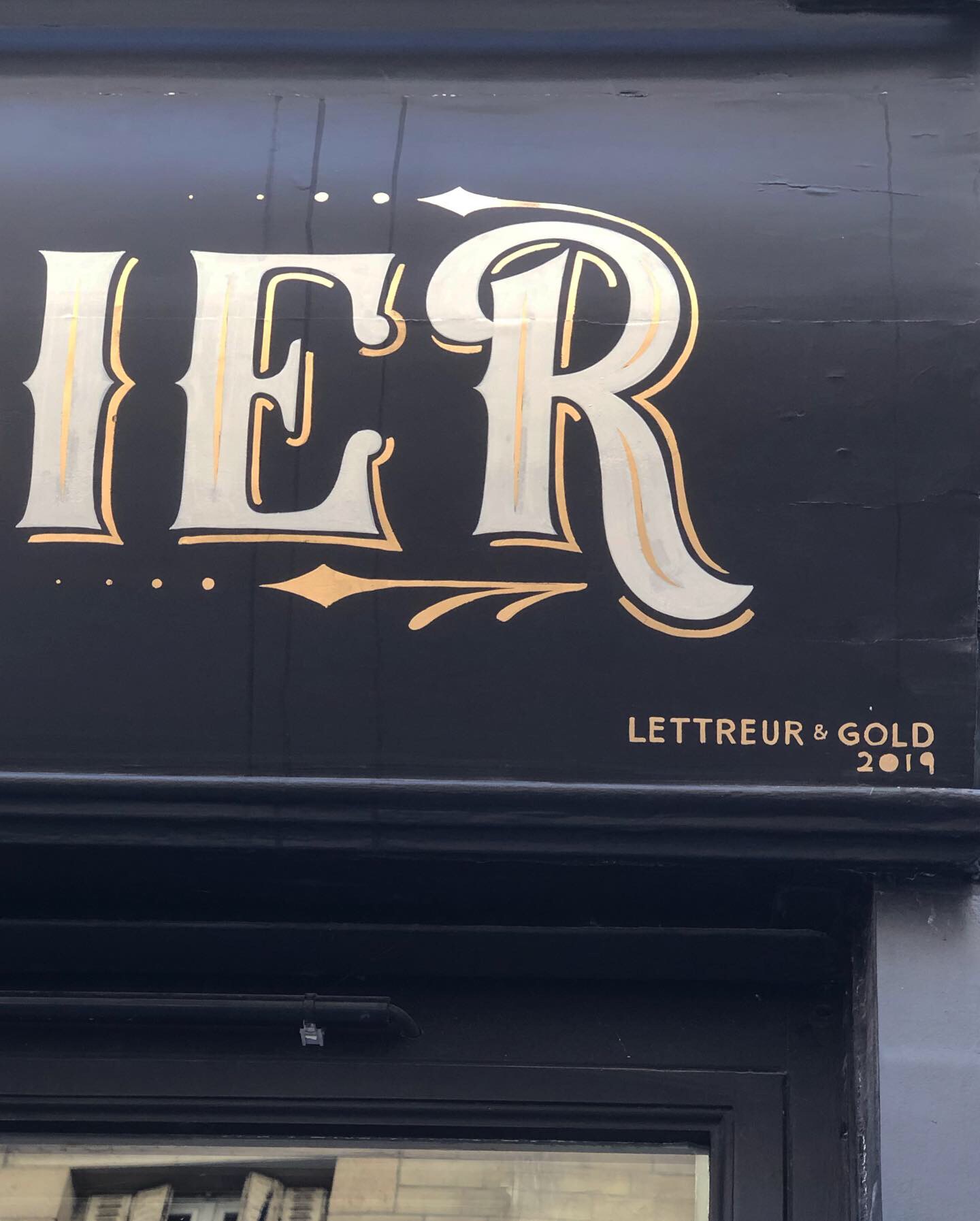 Custom and gilded letterings for the third « Les Mauvais Garçons » barbershop in Paris, in l’île Saint Louis to be precised. Surface gilding on the top sign with 22 carat moon gold and white enamel paint. And water gilding with the same gold tone, white paint and black paint for the windows work.