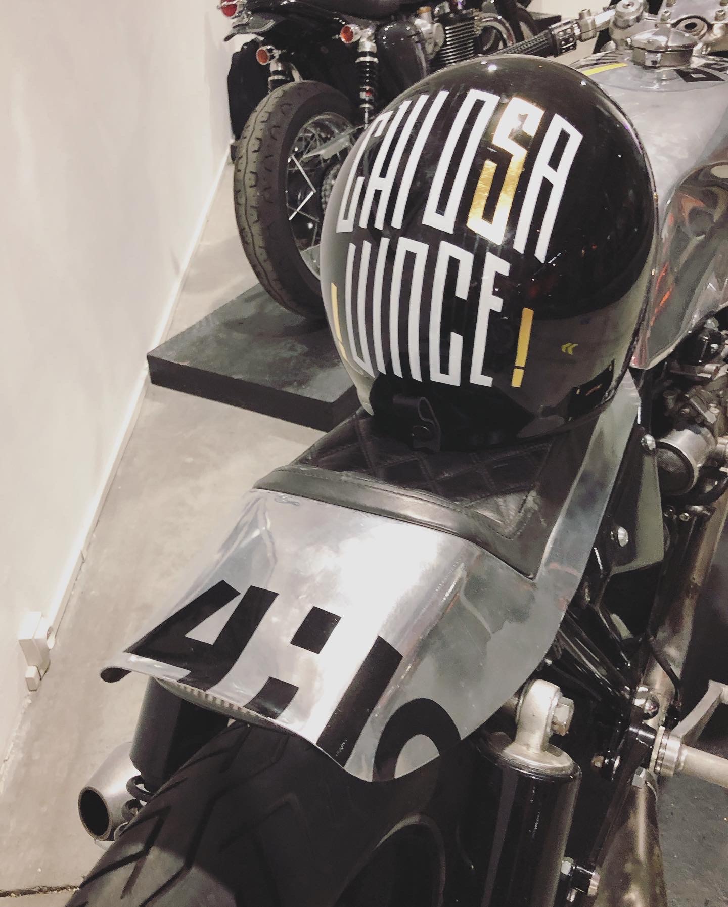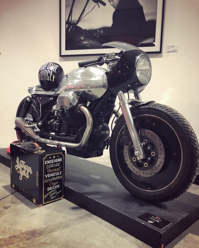 Lettrage sur mesure créé, peint et doré sur un réservoir de Moto Guzzi LeMans III ainsi que sur le capot de selle, et motif crée, peint et doré en adéquation sur le casque. Moto complètement customisée par son propriétaire, John le fondateur du site 4h10.com