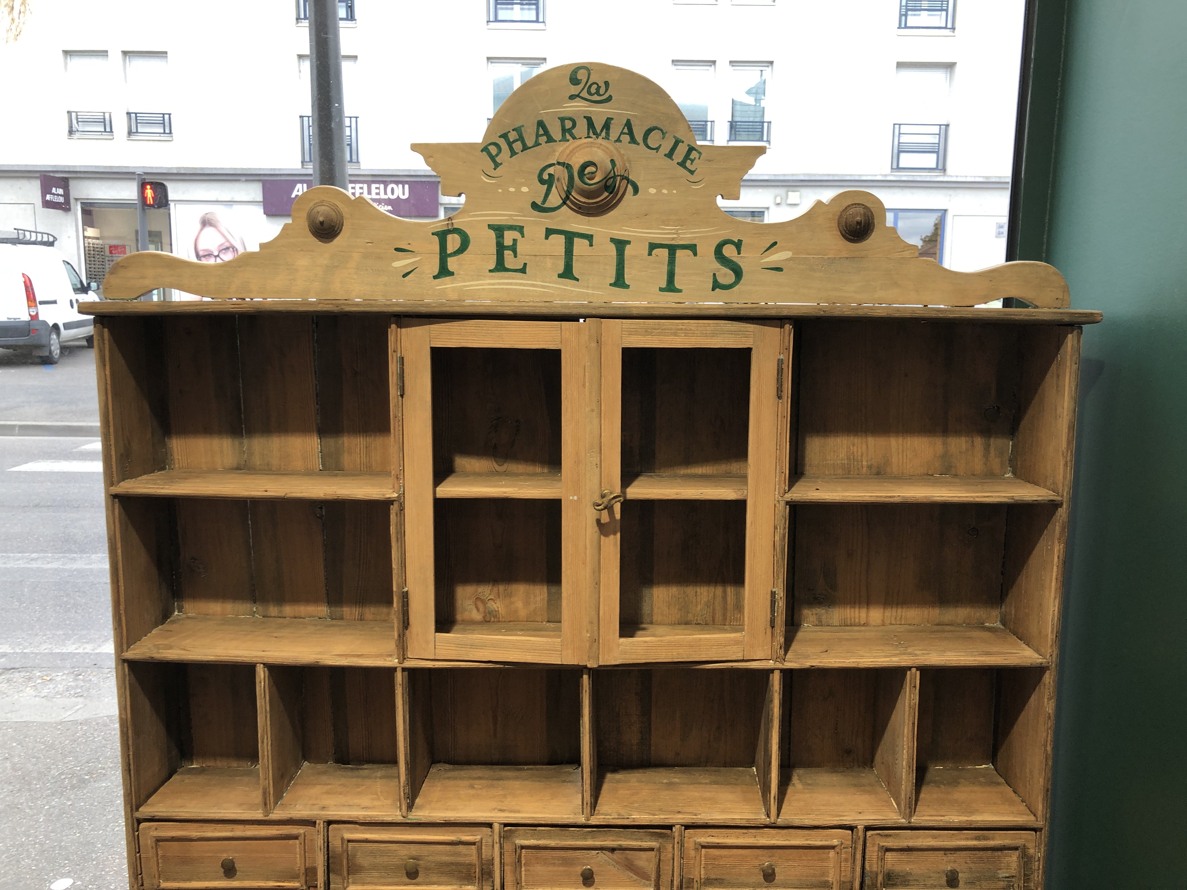 Custom hand painted indor signs for a Pharmacy near Lyon, and also creation of almost 50 panel signs for the alley of the shop.