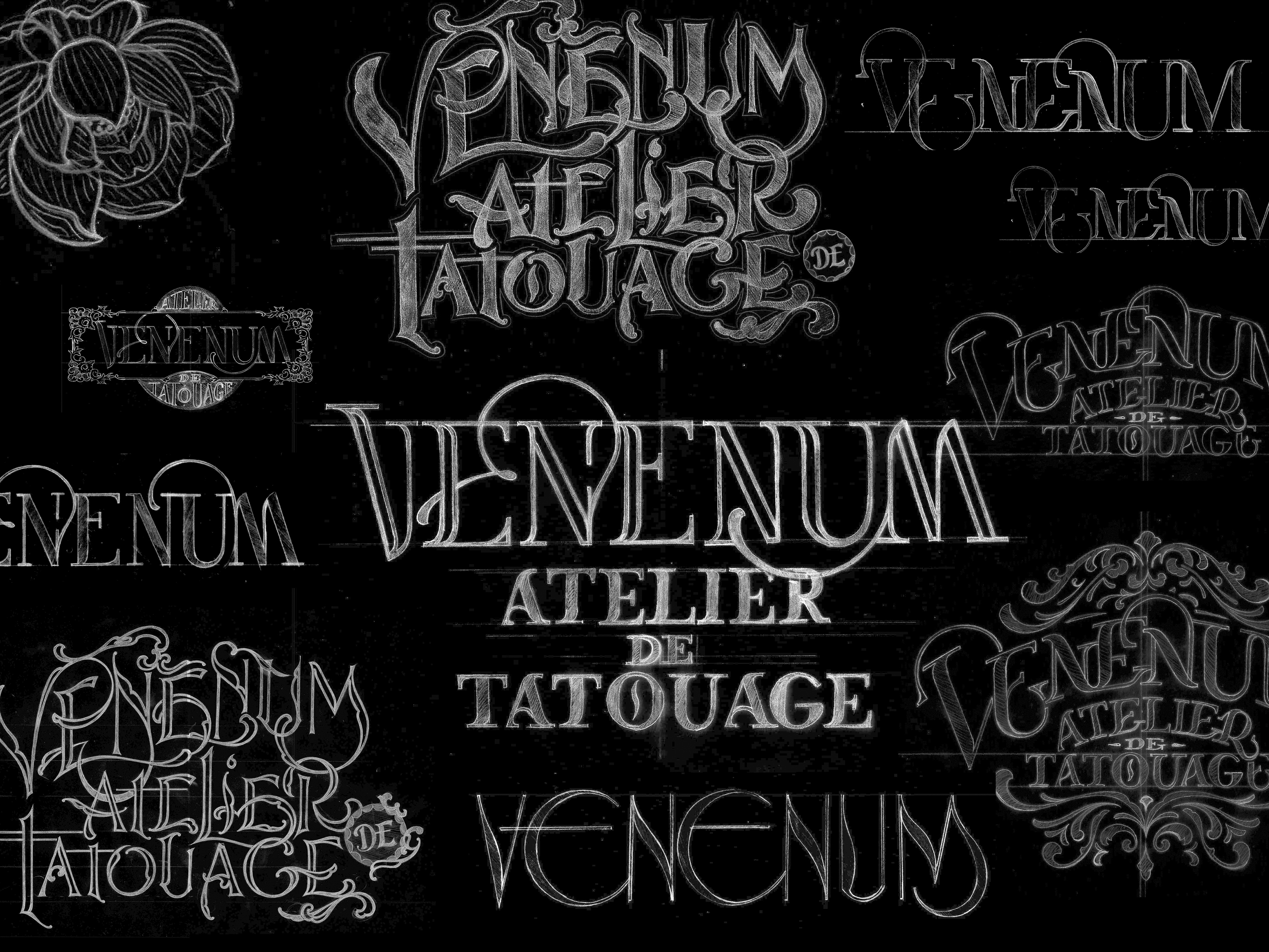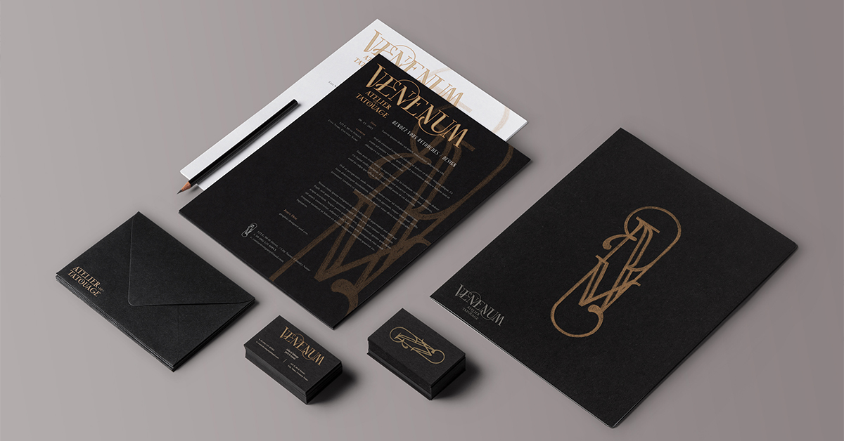 New tattoo shop in Paris Le Marais for Venenum tattoo. New branding with a Lettering logotype that was hand painted and gilded on the front window of the shop. There was also a monogram that was designed following the art direction of the logo, to create a brand new identity for the shop.